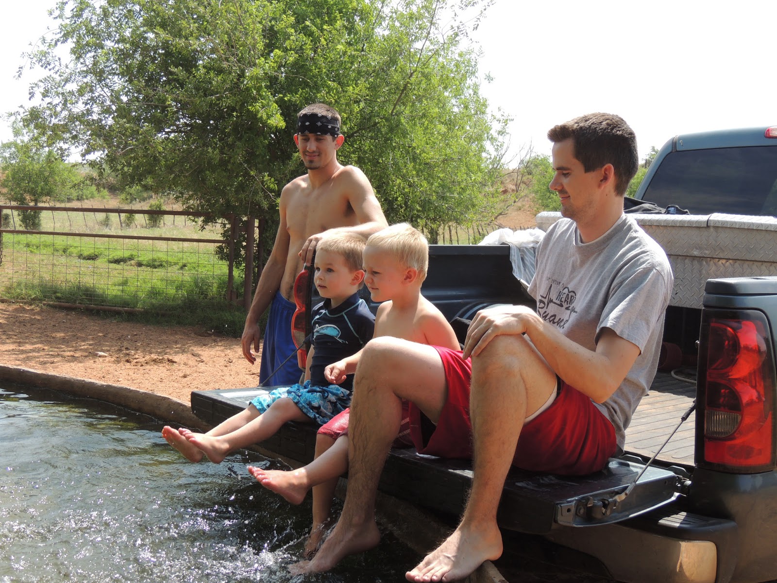 Monday morning Papa tells the boys to "Come one! Let's go swimming!" Brock was heading somewhere else so I grabbed my camera and tagged along. We went to a horse trough at Papa's hunting lease. The boys weren't too sure at first. This is about as close to the water as they would get. We finally threw them in and they were all crying!
